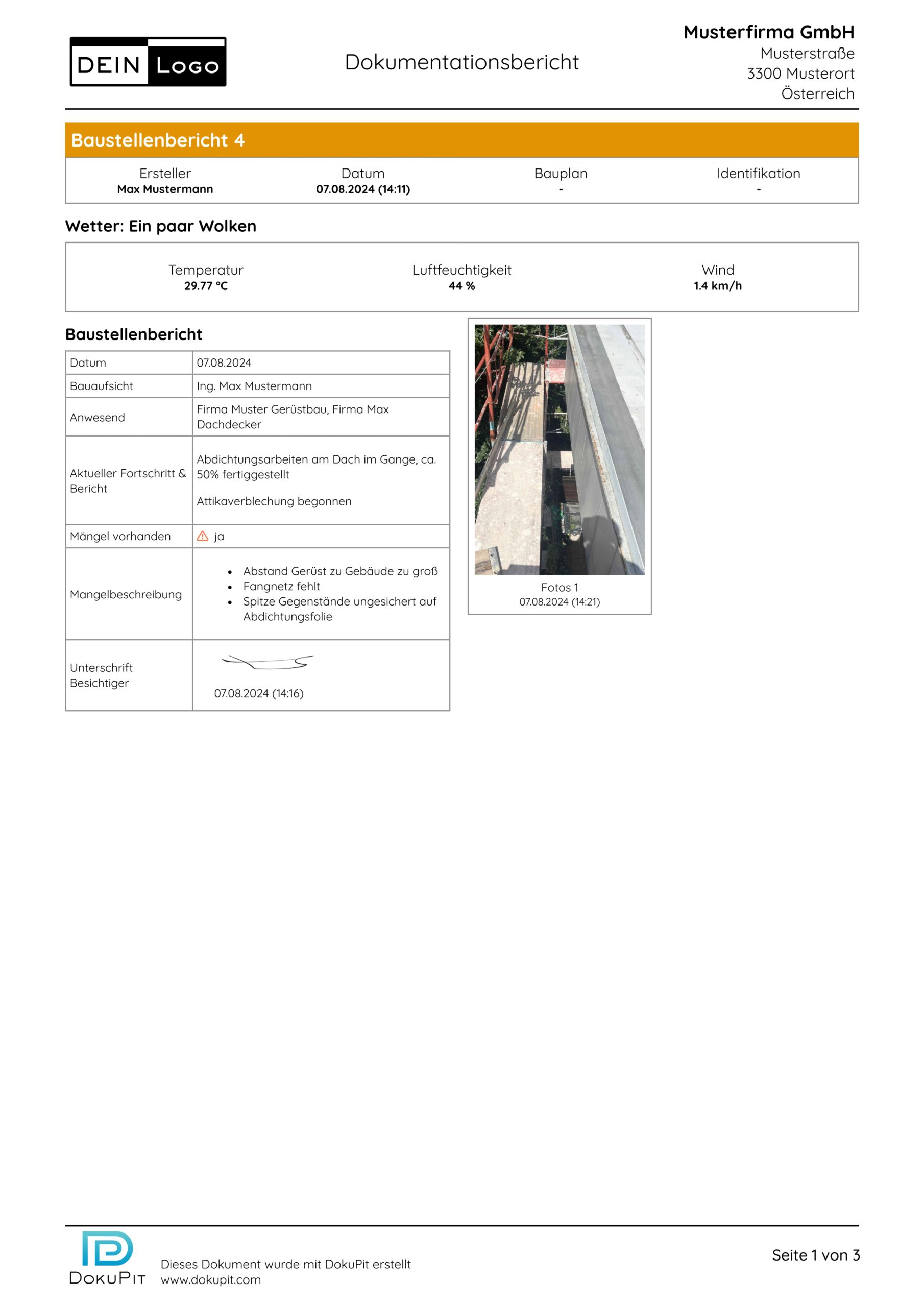Die Dokumentation lässt sich als PDF speichern. Mit dem DokuPit-Designer kannst du Deckblatt, Farben, Fotos, Positionen und Inhalte gezielt festlegen.