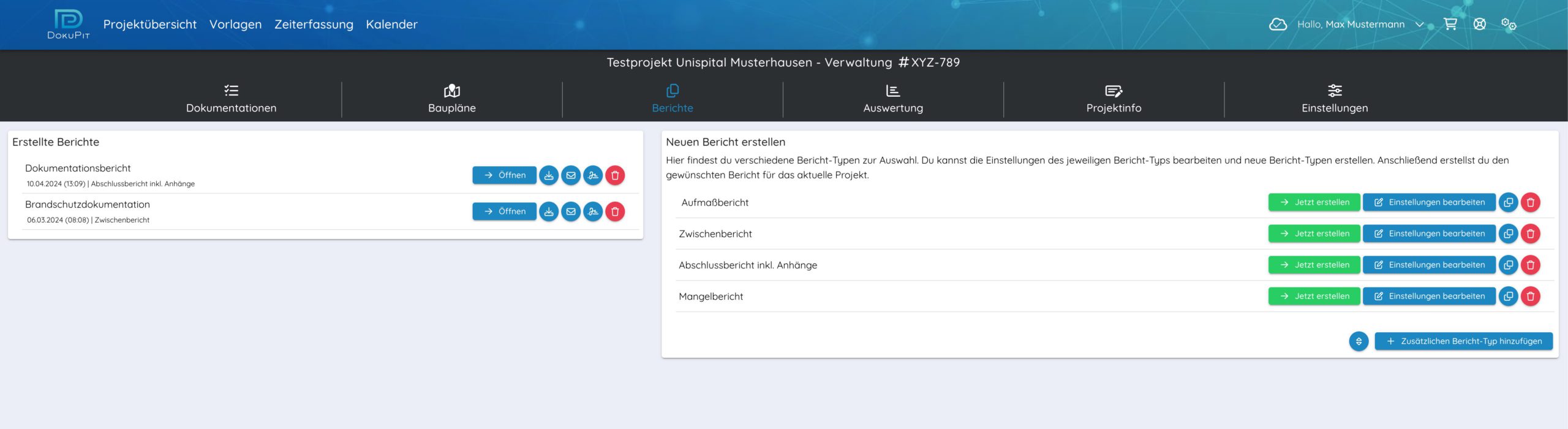 In DokuPit kannst du beliebig viele Bericht-Typen einstellen. Für jeden Typ kannst du festlegen, welche Inhalte im Bericht angedruckt werden sollen, wie das Design aussehen soll und welche Dokumente automatisch angehängt werden sollen.