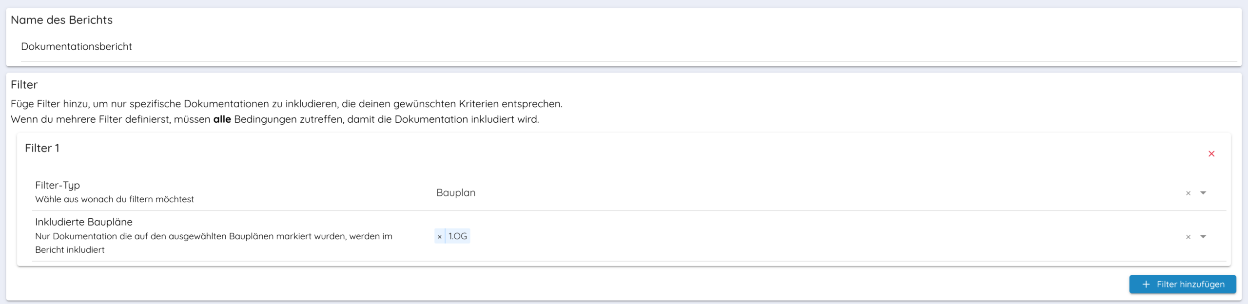 Du möchtest nur Teilbereiche auswerten? Alles ist möglich! Bei jedem Bericht kannst du individuelle Filter hinterlegen und beispielsweise nur Mängel ausgeben, oder nur Dokumentationen im 1.OG.