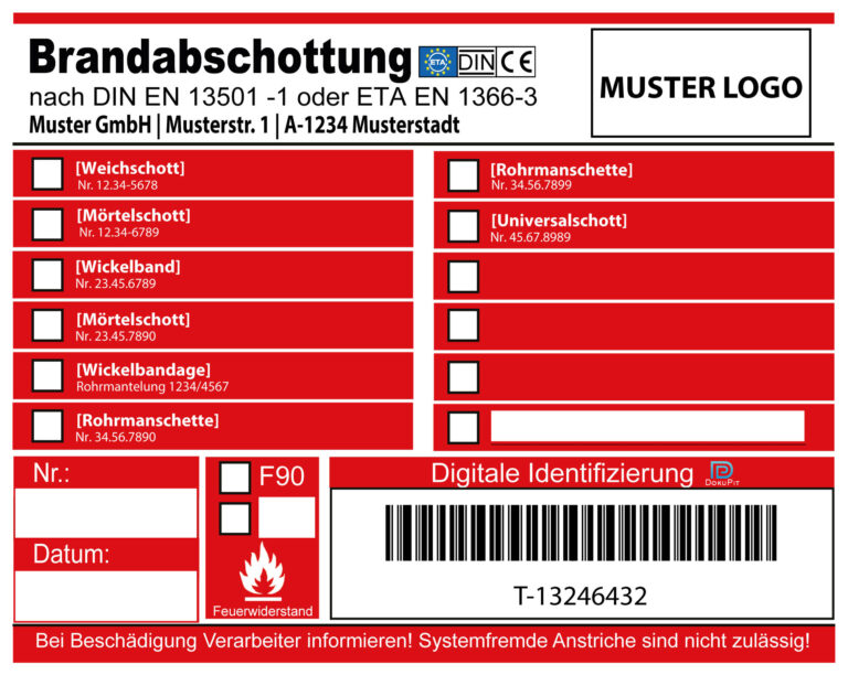 Sinnvoll ist außerdem ein aufgedruckter Identifizierungscode. Der QR-Code ermöglicht es, bei vielen Brandabschottungen oder anderen Arbeiten den Überblick zu behalten. Über das Smartphone oder Tablet kann der Code gescannt werden, um auf dem Bildschirm alle Informationen zur Tätigkeit zu erhalten. So geht keine Information mehr verloren und deine Kunden sind immer auf dem neuesten Stand.